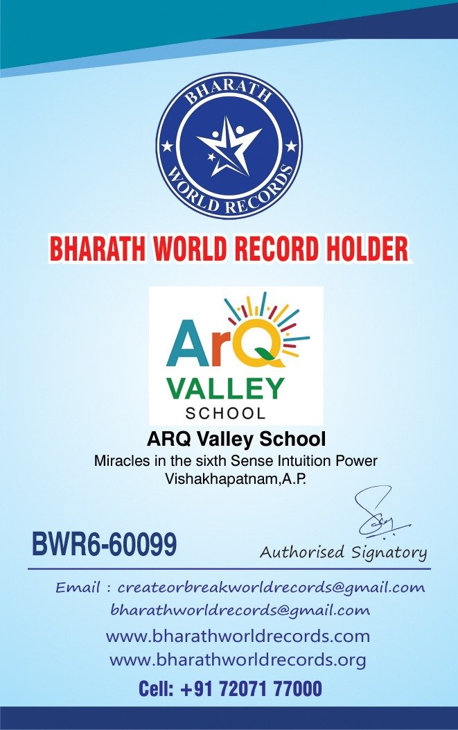 has achieved BHARATH WORLD RECORDS for the extreme talent in Sixth sence remarkable feats such as performing activities while blindfolded feats and driving with blindfold,sensing objects through the feet using sole-sense perception, identifying ball colors without physical touch even when concealed, and intuitively replicating drawings created by others without visual input—showcasing the practical and transformative potential of the sixth sense, organised and Trained by Mrs.Dr.Majji Sai Laxmi-Chairman ,ArQ Valley School Andhra Pradessh,India.
